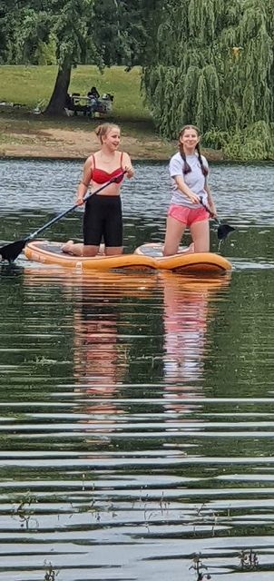 Trotz des Umwegs noch pünktlich, bekamen die Mädels vom Veranstalter der Paddel-Aktion die „Luftbretter“ und Luftpumpen ausgehändigt. Der erste anstrengende Akt war das mühselige Aufpumpen der Luftbretter. Ohne Luft gehts aber nicht.