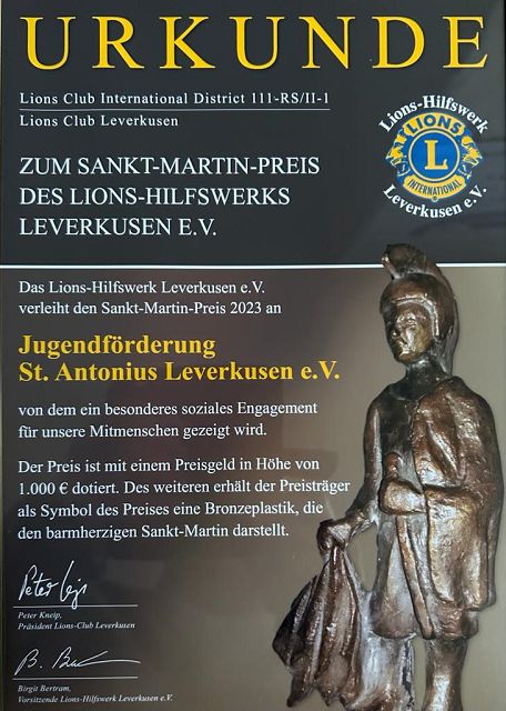 So konnte man es im November in den Leverkusener Tageszeitungen lesen. Nach vielen Jahren ist die Arbeit des Vereins in einem ganz besonderen Maße gewürdigt worden. Lions-Club-Vizepräsident Peter Kneip überreichte in einem feierlichen Rahmen den ältesten Ehrenamtspreis der Stadt – die Bronze des Heiligen Martin. Im Beisein von Frau Bertram vom Lions Hilfswerk, Bürgermeister Marewski und vielen Gästen wurde dem Verein die Bronzeplastik und die Urkunde überreicht.